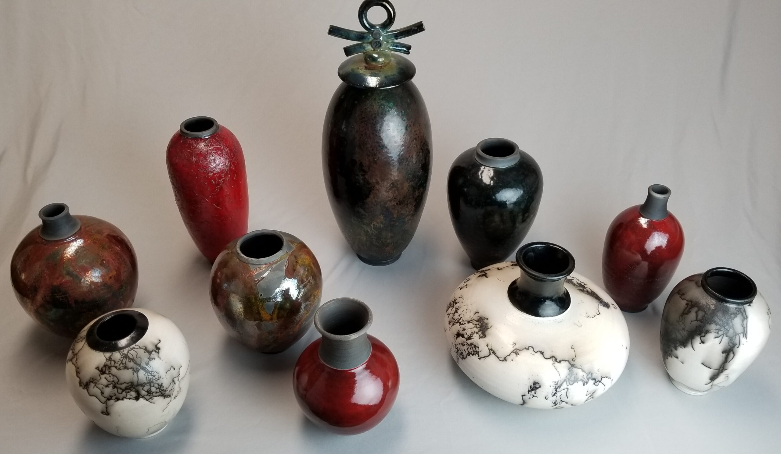 Raku firing is central to the studio’s work. Flame, smoke, oxygen and timing all contribute to the final surface producing finishes shaped by crackle, carbon, luster, tonal variation and texture. While the process can be guided through experience, it cannot be fully controlled. Each firing introduces variables that leave a permanent record on the surface of the piece.